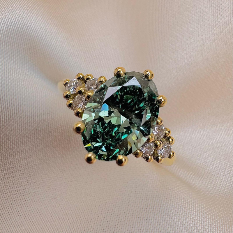 Ring gemaakt in 18kt geel goud gezet met groene en witte labo diamanten.