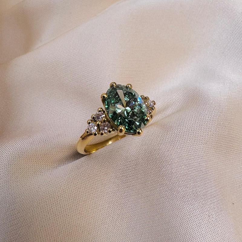 Verlovingsring in 18kt geel goud + groene en roze labo diamant